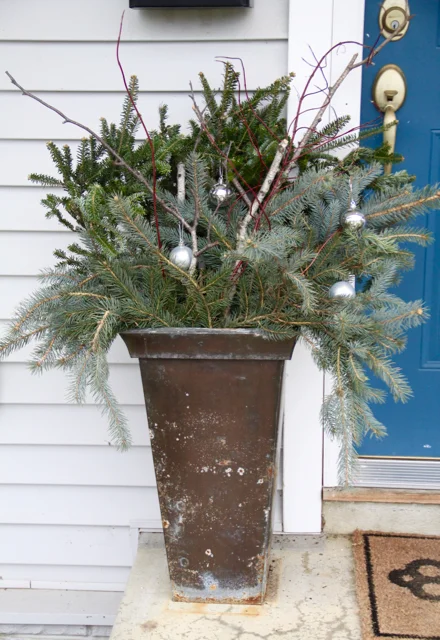 Learn how to make this simple diy wood planter with this great tutorial and lots of step by step photos. See more ideas about winter planter, christmas planters, christmas urns. This one includes white ornamental cabbage, yellow twig dogwood branches, cedar branches, fir tree branches and some eucalyptus. Tuck the cut ends of the evergreen branches into the soil and keep adding around the container for a full and lush look.
